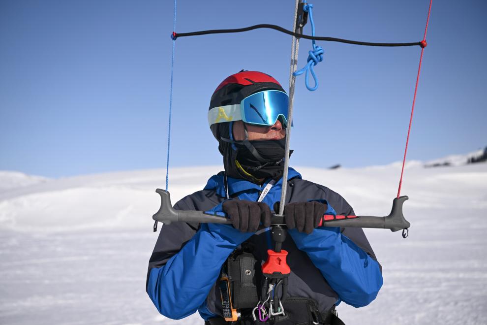滑雪者手持的是风筝滑雪控制手柄,其设置有快速脱离装置。新华社记者 胡虎虎 摄
