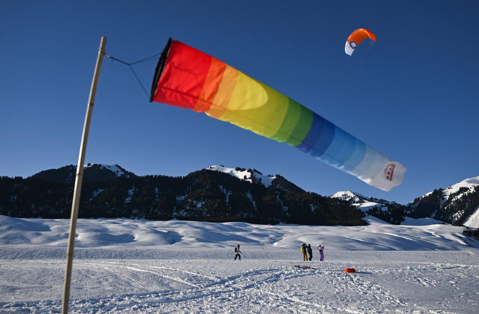 滑雪者在抵达准备进行风筝滑雪的场地后测量现场风力。新华社记者 胡虎虎 摄