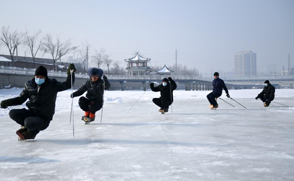 2021年2月7日,市民在长春市伊通河畔的冰场上滑单刀冰车。新华社记者 颜麟蕴 摄