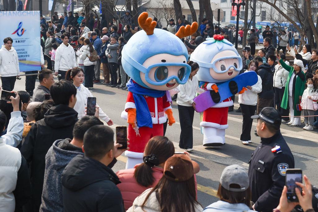 2026年3月21日,吉祥物“吉冰”“吉雪”在长春新民大街上巡游。新华社记者 张楠 摄