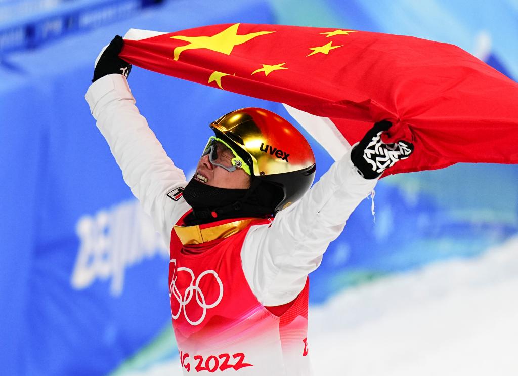 2022年2月16日,在北京2022年冬奥会自由式滑雪男子空中技巧决赛中,中国选手齐广璞获得冠军。新华社记者 许畅 摄