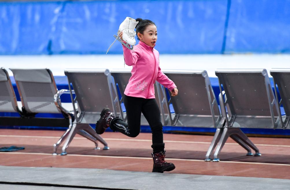 2021年3月7日,在吉林省“百万青少年上冰雪”推广活动上,一名花样滑冰小选手举着冰鞋跑向她的教练。新华社记者 许畅 摄