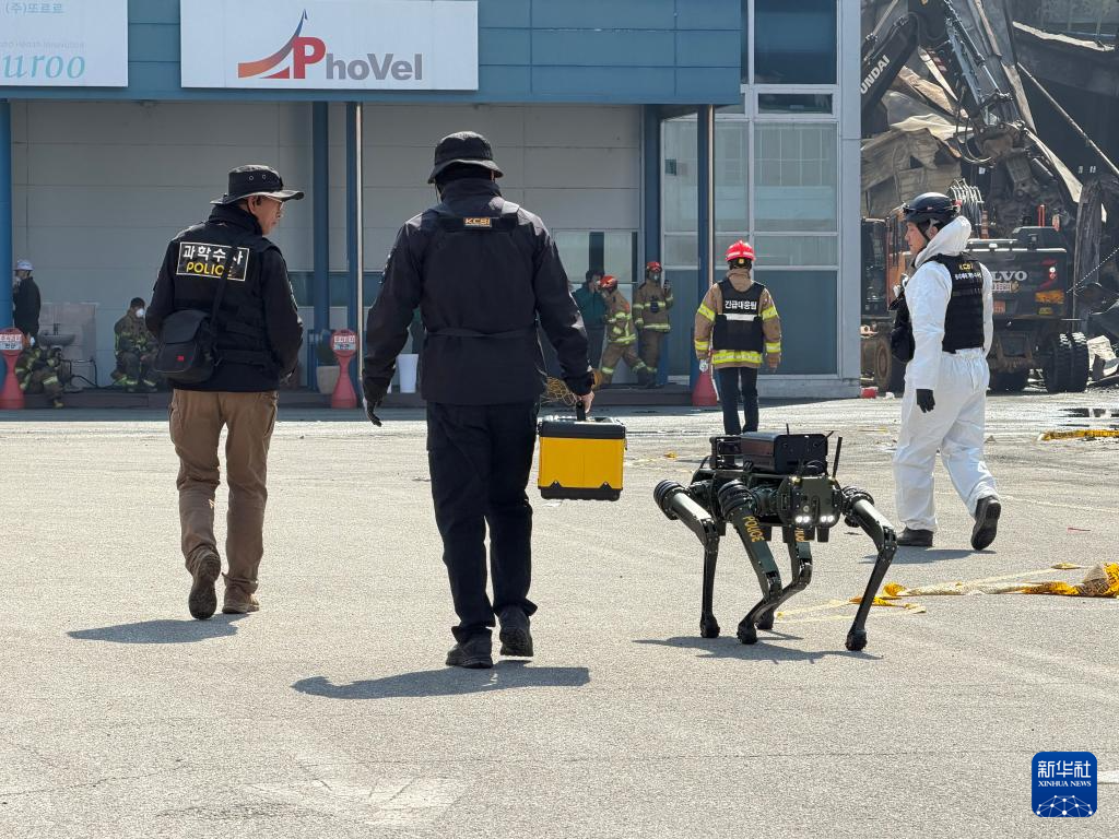 3月21日,救援人员和救援机器狗在韩国大田工厂火灾现场工作(手机照片)。新华社记者 张粲 摄