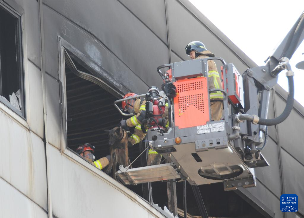 3月21日,救援人员将搜救犬送入韩国大田工厂火灾现场进行搜救。新华社记者 朱辉 摄