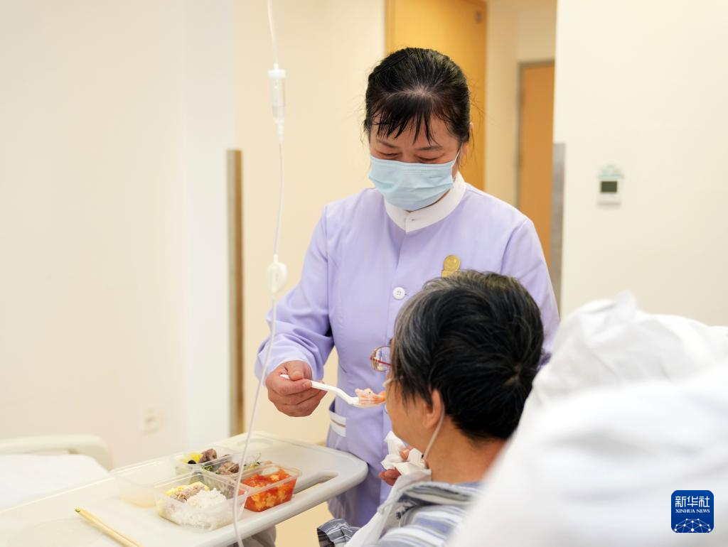 在上海市肺科医院免陪照护病房,医疗护理员在给患者喂饭(2026年2月26日摄)。新华社记者 刘颖 摄