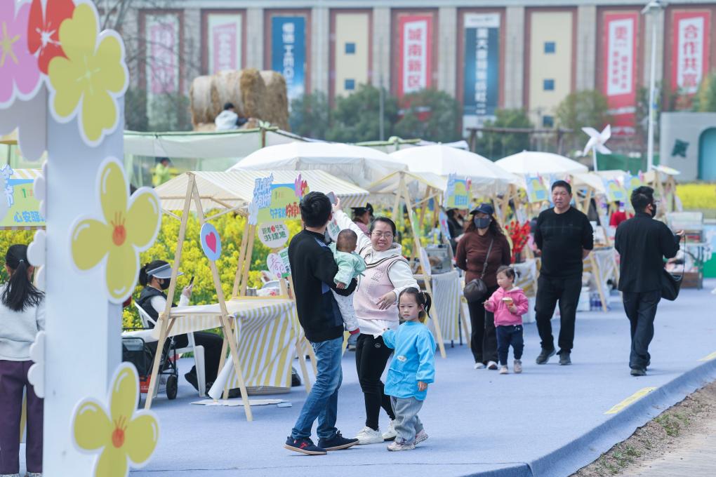 建德市更楼街道城南城市田园油菜花田边的消费市集。新华社记者 徐昱 摄
