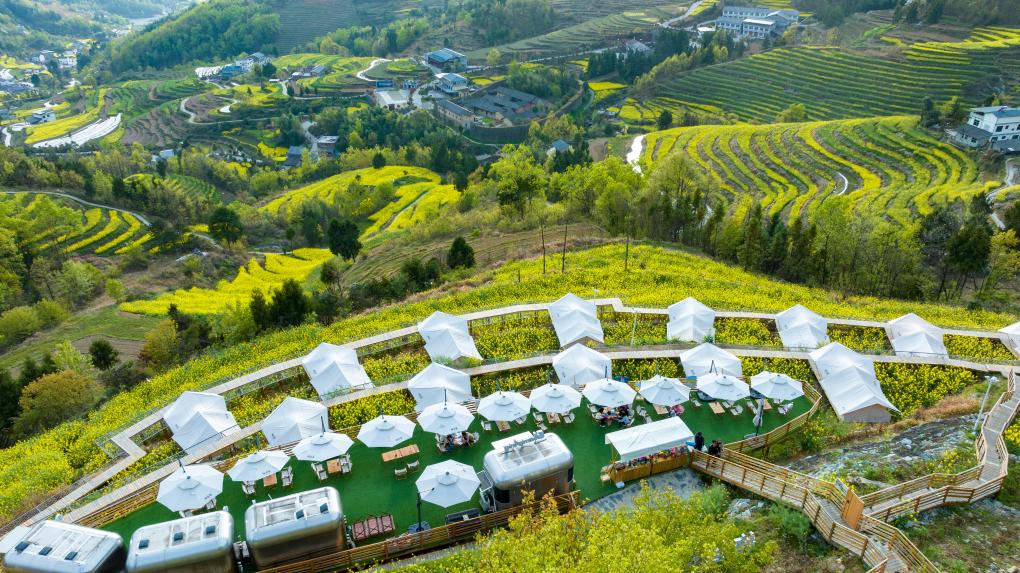 游客在凤堰梯田一处营地欣赏油菜花海。新华社发(邵向东摄)