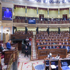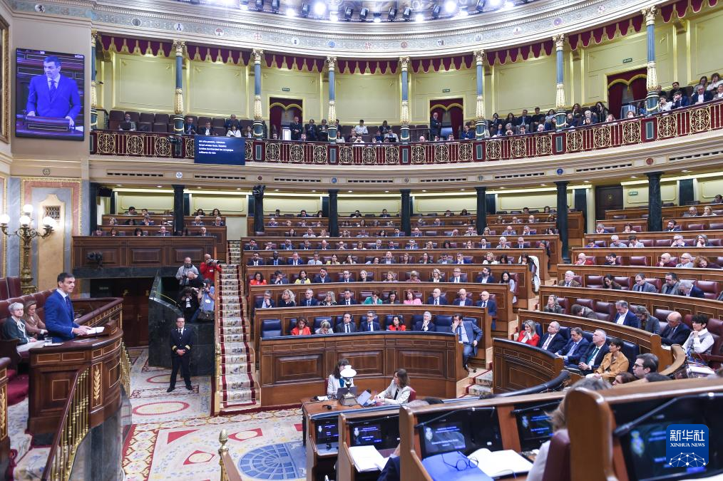 3月25日,在西班牙首都马德里,西班牙首相桑切斯在众议院发表讲话,重申西班牙政府始终坚持反对中东战争的立场。新华社发(古斯塔沃·巴连特摄)