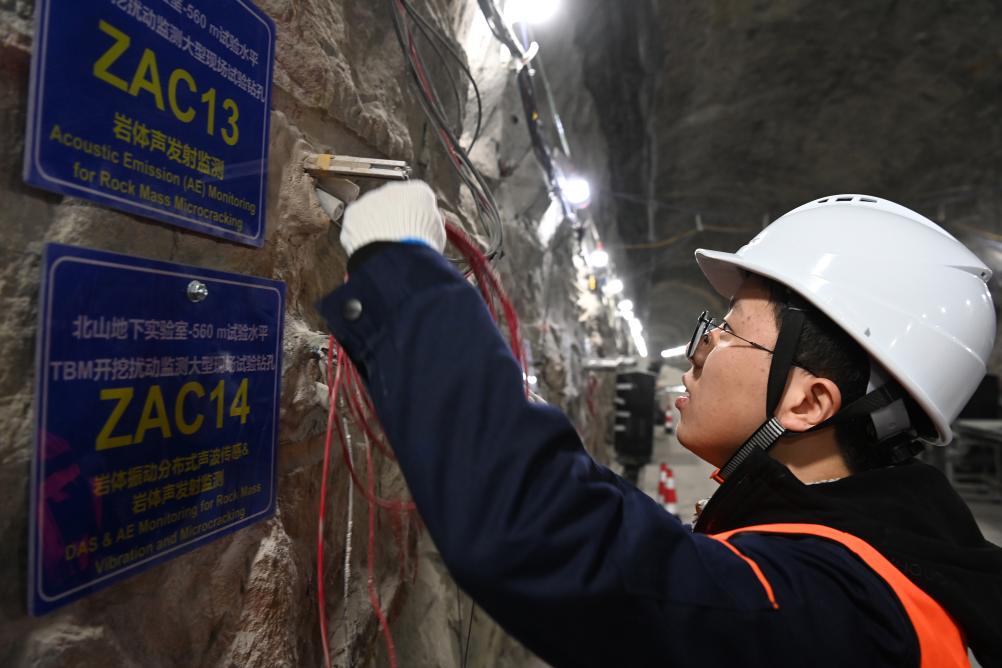 在北山实验室地下560米作业平台,工程师叶勇查看实验设备。新华社记者 范培珅 摄