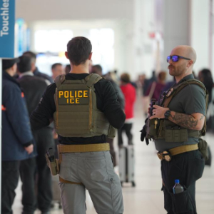 3月23日,移民与海关执法局的执法人员在美国纽约拉瓜迪亚机场的出发安检处执勤。新华社记者张凤国摄