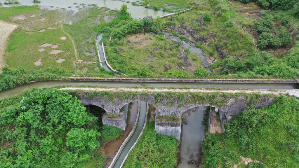 巨丰堰、永丰堰与平江河支流在三拱桥渡槽处呈立交分布。新华社发(付冲 摄)