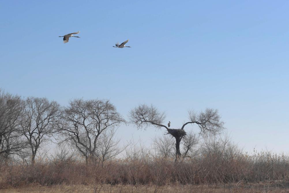 3月28日,在黑龙江省齐齐哈尔市克钦湖湿地,两只丹顶鹤在东方白鹳巢上空飞过。新华社发(王勇刚 摄)