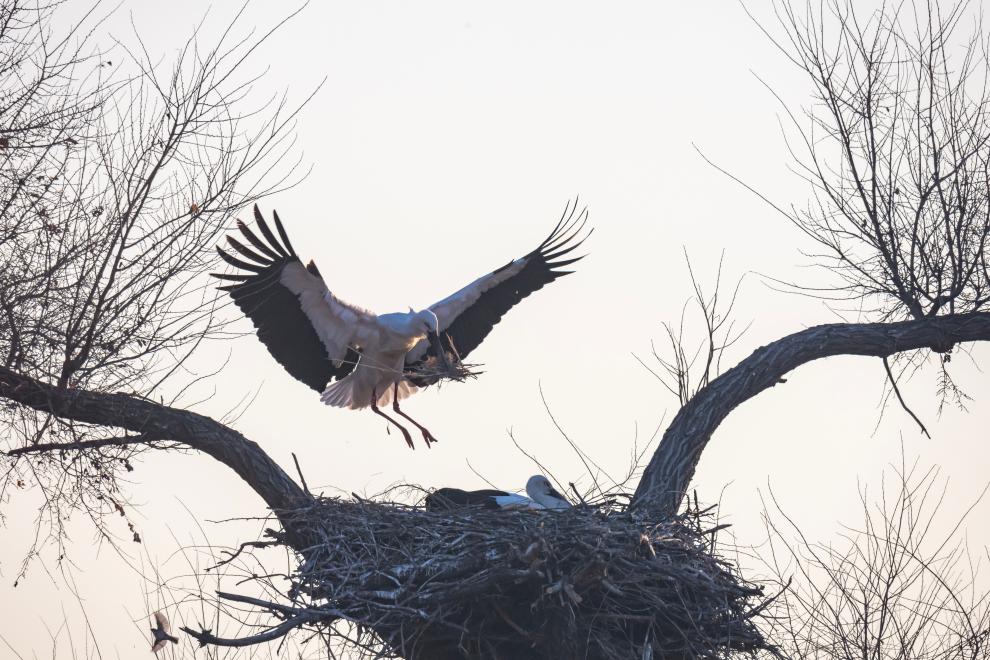 3月28日,在黑龙江省齐齐哈尔市克钦湖湿地,东方白鹳叼草回巢。新华社发(王勇刚 摄)