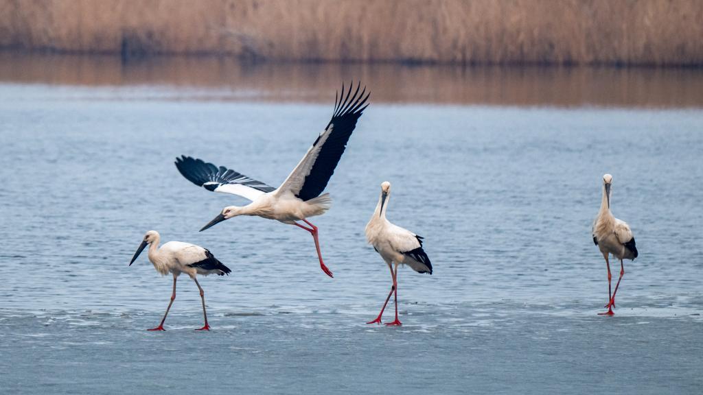 3月19日,一群东方白鹳在松花江哈尔滨段一处水域觅食(无人机照片)。新华社发(张树 摄)