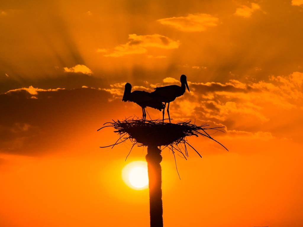 3月28日,在黑龙江省肇东市千鹤岛旅游风景区,夕阳下的东方白鹳在巢中休息(无人机照片)。新华社发(刘大鹏 摄)