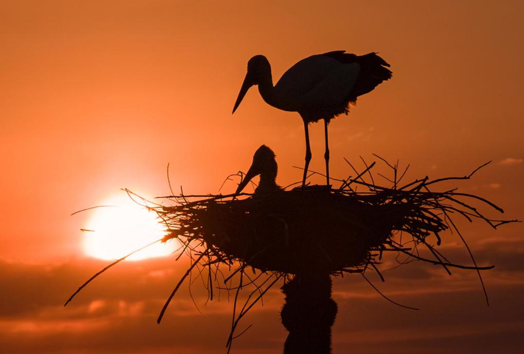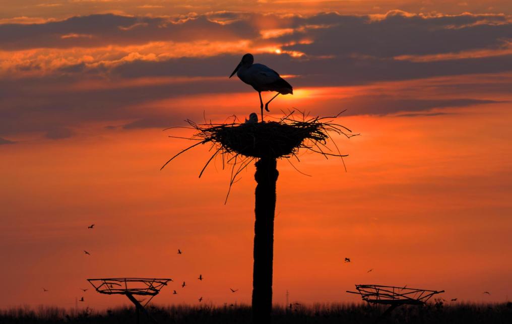 这是4月1日在黑龙江省肇东市千鹤岛旅游风景区拍摄的晨光中的东方白鹳(无人机照片)。新华社发(刘大鹏 摄)