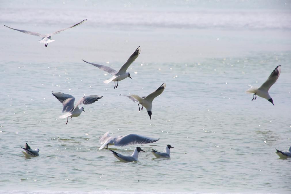 3月30日,一群红嘴鸥在松花江哈尔滨段的暮色中翻飞觅食(无人机照片)。新华社发(张树 摄)
