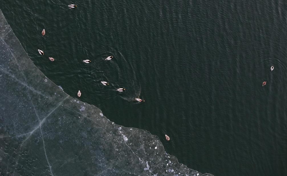 3月30日,一群候鸟在松花江哈尔滨段一处水域游弋(无人机照片)。新华社发(张树 摄)