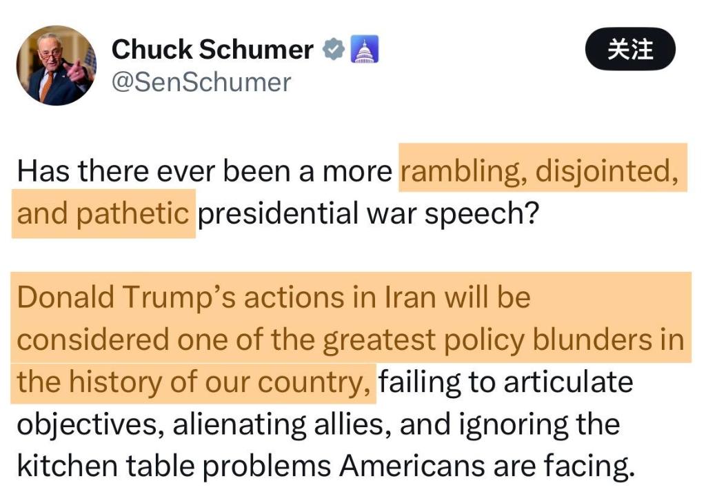 ——美国参议院民主党领袖查克·舒默在社交媒体上写道:特朗普的讲话“内容散漫、逻辑混乱、非常可悲”,“他在伊朗的所作所为将被视为我们国家历史上最严重的政策失败之一”。