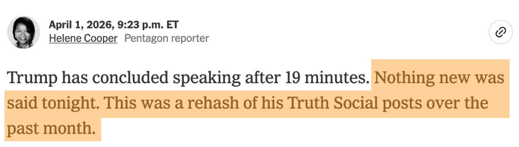 ——社交媒体网民在特朗普讲话直播中留言:“这是这个愚人节最愚蠢的一次讲话。”