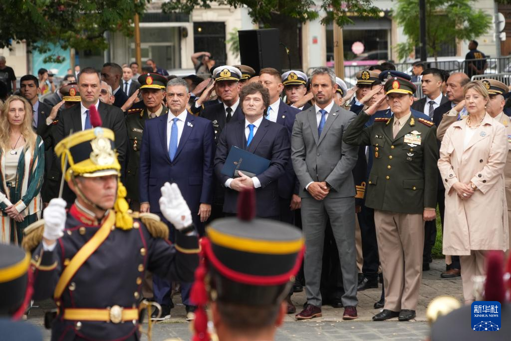 4月2日,阿根廷总统米莱(中)在阿根廷布宜诺斯艾利斯参加纪念马尔维纳斯群岛战争活动。新华社记者 张铎 摄