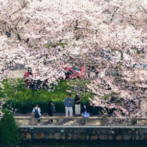 4月5日,人们在江苏省常熟市的护城河畔赏花(无人机照片)。新华社发(杨素平摄)