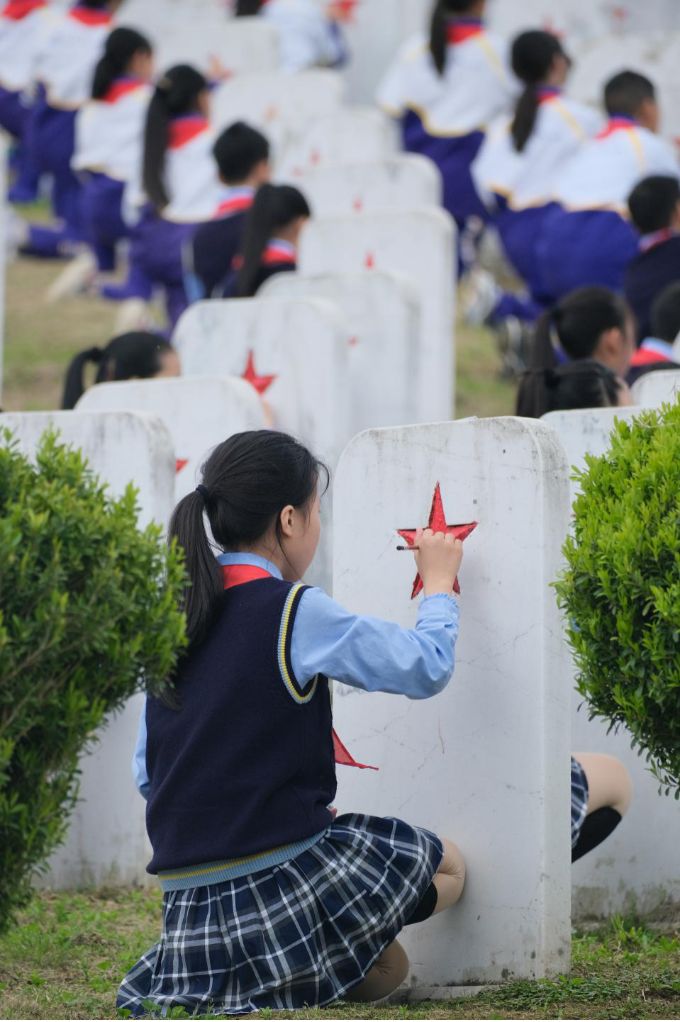 ↑川陕革命根据地红军烈士陵园内,通江县中小学的学生为无名墓碑上的红星描红。新华社记者高玉娇 摄