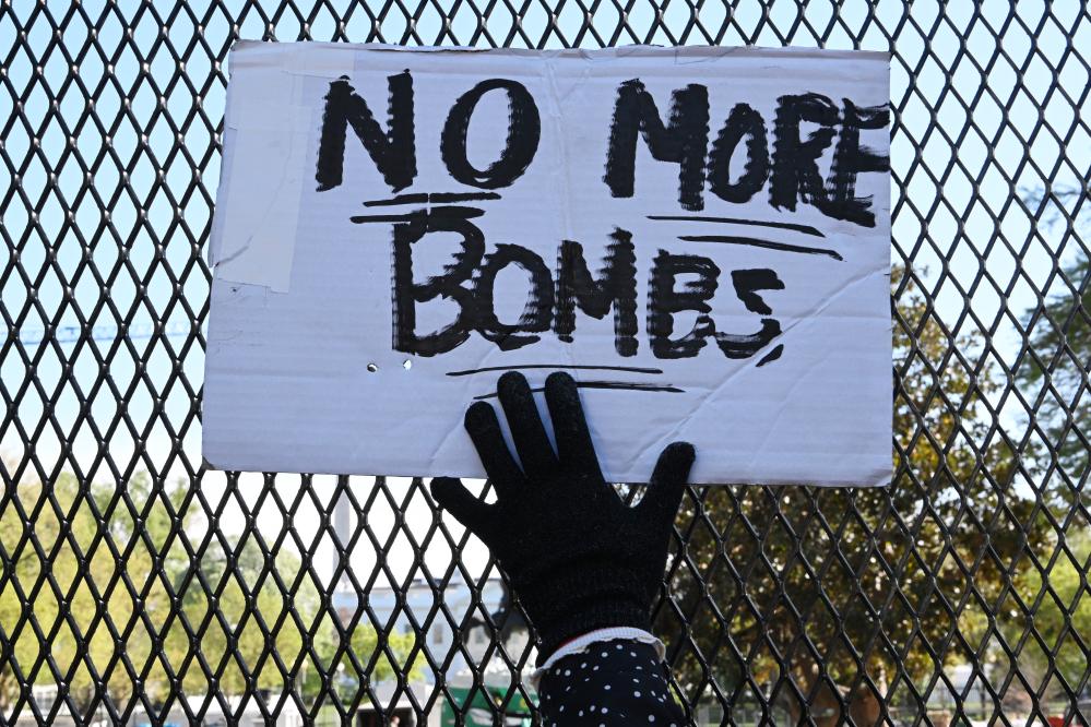 4月7日,一名示威者在美国首都华盛顿的白宫前手举标语。新华社记者李睿摄