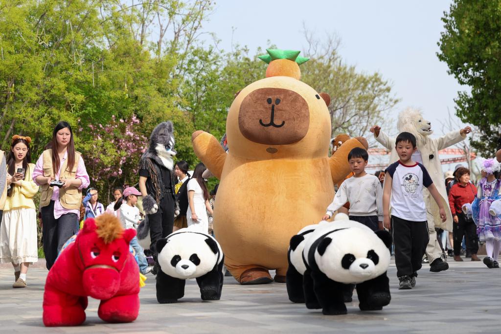 4月4日,游客在湖北省襄阳市华侨城奇幻谷景区观看神奇动物大迁徙巡游表演。新华社发(杨东 摄)