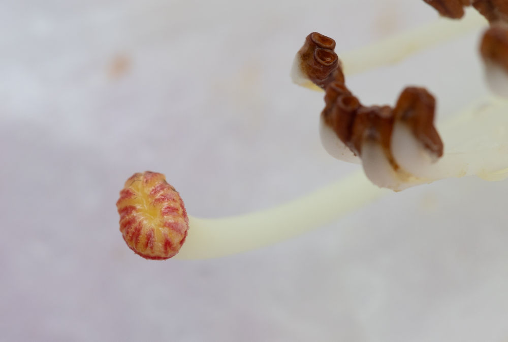 这是凸尖杜鹃雌蕊柱头(4月8日摄于成都市都江堰龙池国家森林公园里的华西亚高山植物园)。