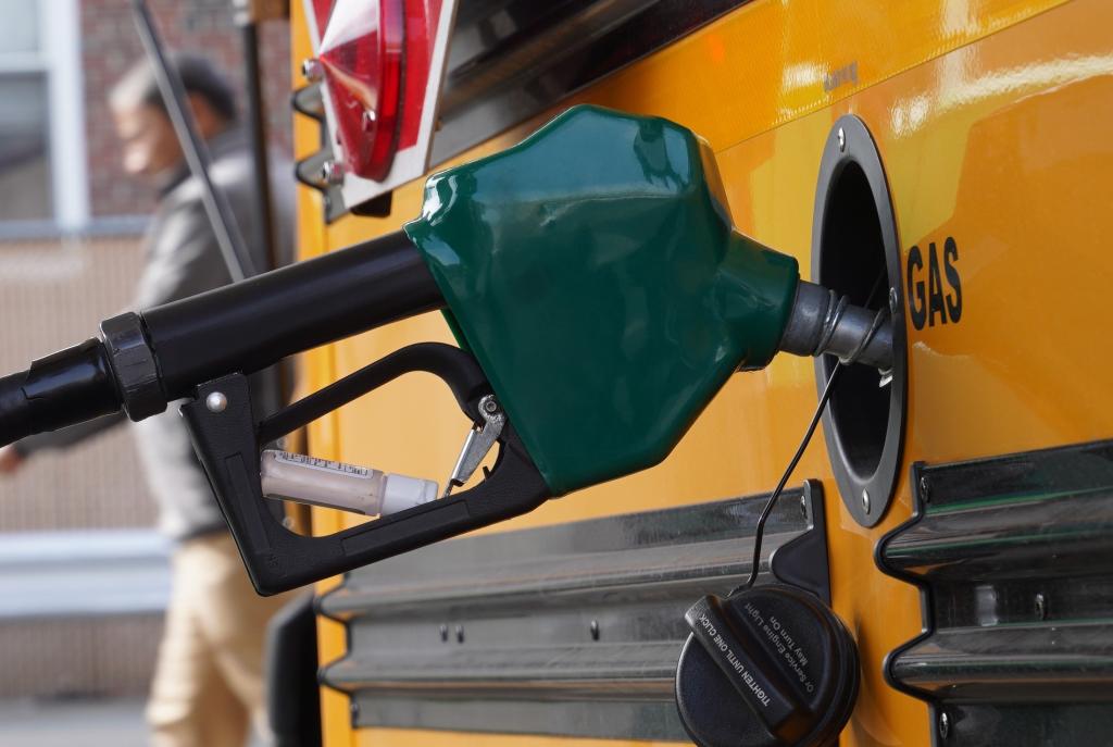 3月31日,一辆校车在美国纽约的加油站加油。新华社记者张凤国摄