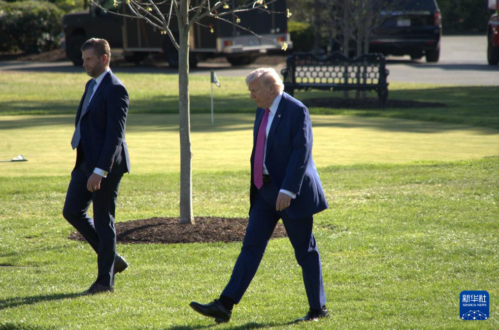 4月10日,美国总统特朗普(右)准备乘直升机离开华盛顿白宫。新华社发(李源清摄)