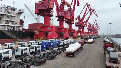 在江苏连云港港赣榆港区散货码头,一辆辆国产车辆和各类工程机械设备正有序装船,整装待发。今年以来,港区销往南亚、中亚、波斯湾、西非等地区的出口订单稳步增长,国产客车、矿卡、自卸车、挖掘机、装载机等工程机械成为出口主力。