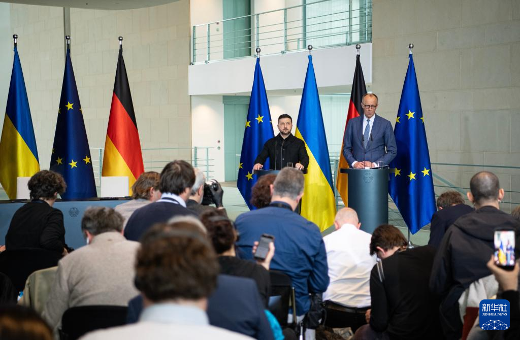 4月14日,德国总理默茨(右)和乌克兰总统泽连斯基在位于柏林的德国总理府出席记者会。新华社记者 张豪夫 摄
