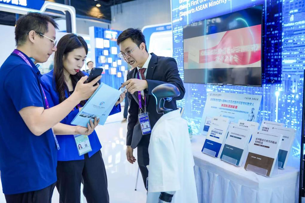 2025年9月20日,在第22届中国—东盟博览会现场,广西医科大学越南留学生范忠孝(右)向媒体介绍“泌语医谈”AI数字医生。新华社发