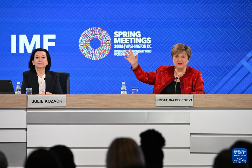 4月15日,在美国首都华盛顿,国际货币基金组织(IMF)总裁格奥尔基耶娃(右)在IMF和世界银行春季会议期间的新闻发布会上讲话。新华社记者 李睿 摄