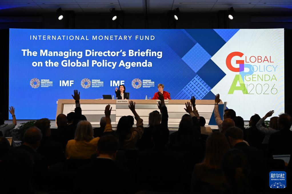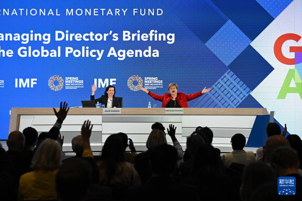 4月15日,在美国首都华盛顿,国际货币基金组织(IMF)总裁格奥尔基耶娃(上右)在IMF和世界银行春季会议期间的新闻发布会上讲话。新华社记者 李睿 摄