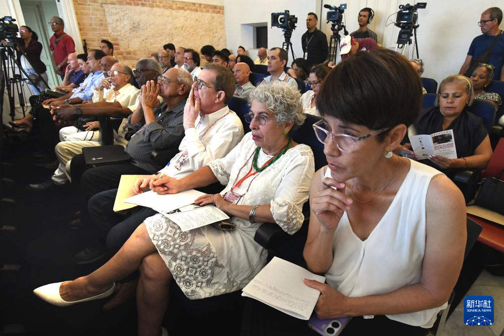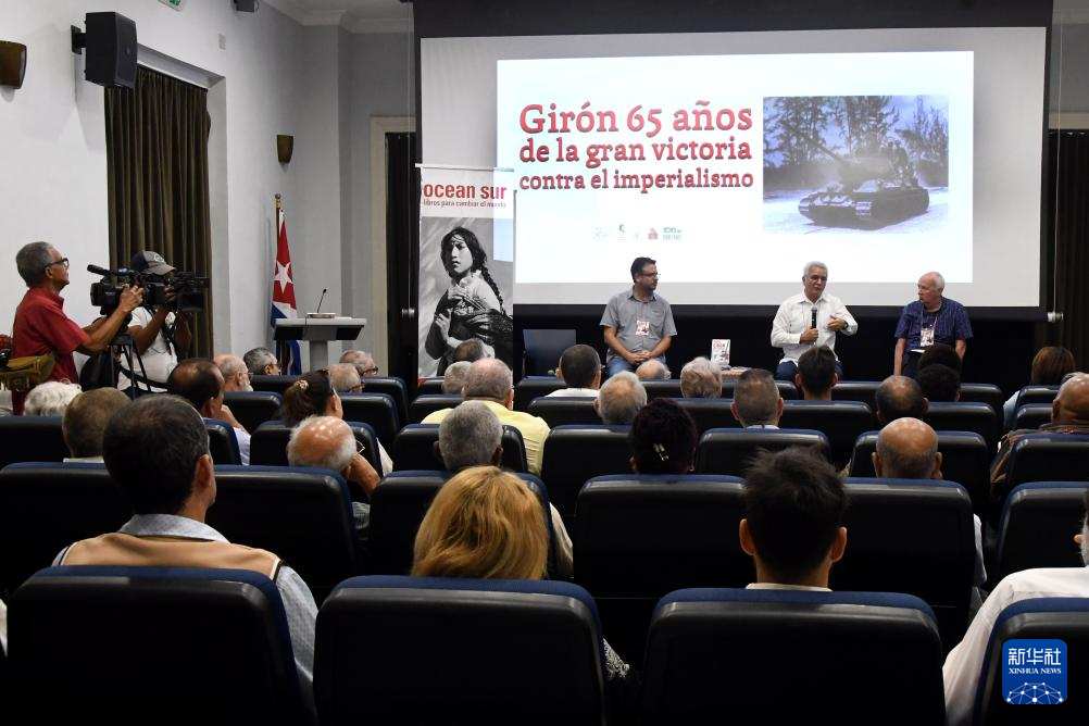 4月14日,在古巴首都哈瓦那的菲德尔·卡斯特罗·鲁斯中心,人们参加“吉隆滩:反帝国主义胜利65周年”学术研讨会。新华社发(华金·埃尔南德斯摄)