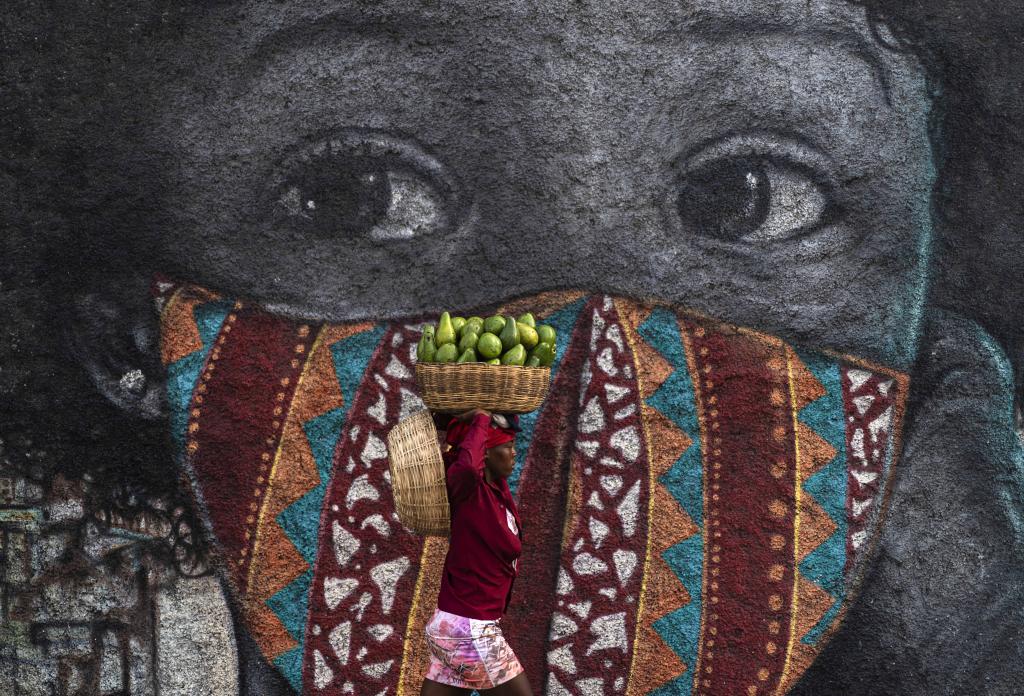 2021年8月24日,一名女子头顶水果走在海地太子港街头。新华社发(戴维·德拉帕斯摄)