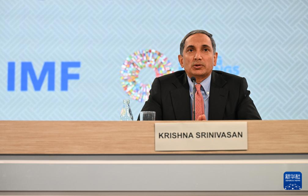 4月16日,在美国华盛顿,国际货币基金组织(IMF)亚太部主任斯里尼瓦桑在新闻发布会上讲话。新华社记者 李睿 摄