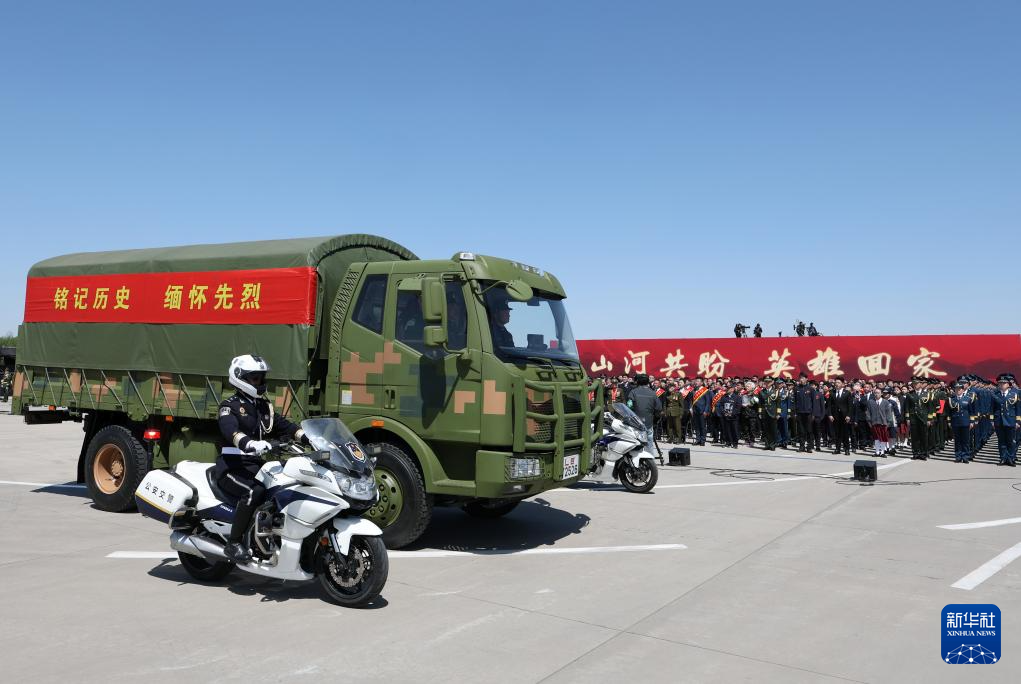 4月22日,礼兵护送志愿军烈士遗骸棺椁抵达沈阳抗美援朝烈士陵园。4月22日上午,第十三批在韩中国人民志愿军烈士遗骸由中国空军运-20B从韩国接回辽宁沈阳。12位志愿军烈士英灵及146件遗物回到祖国怀抱。新华社记者 杨青 摄