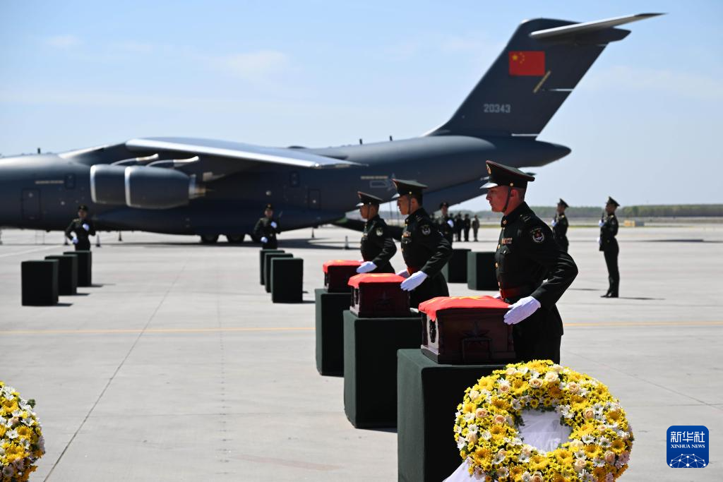 4月22日,第十三批在韩中国人民志愿军烈士遗骸由中国空军运-20B从韩国接回辽宁沈阳。这是迎回仪式上,礼兵将覆盖着五星红旗的志愿军烈士遗骸棺椁整齐安放。4月22日上午,第十三批在韩中国人民志愿军烈士遗骸由中国空军运-20B从韩国接回辽宁沈阳。12位志愿军烈士英灵及146件遗物回到祖国怀抱。新华社发(余红春 摄)