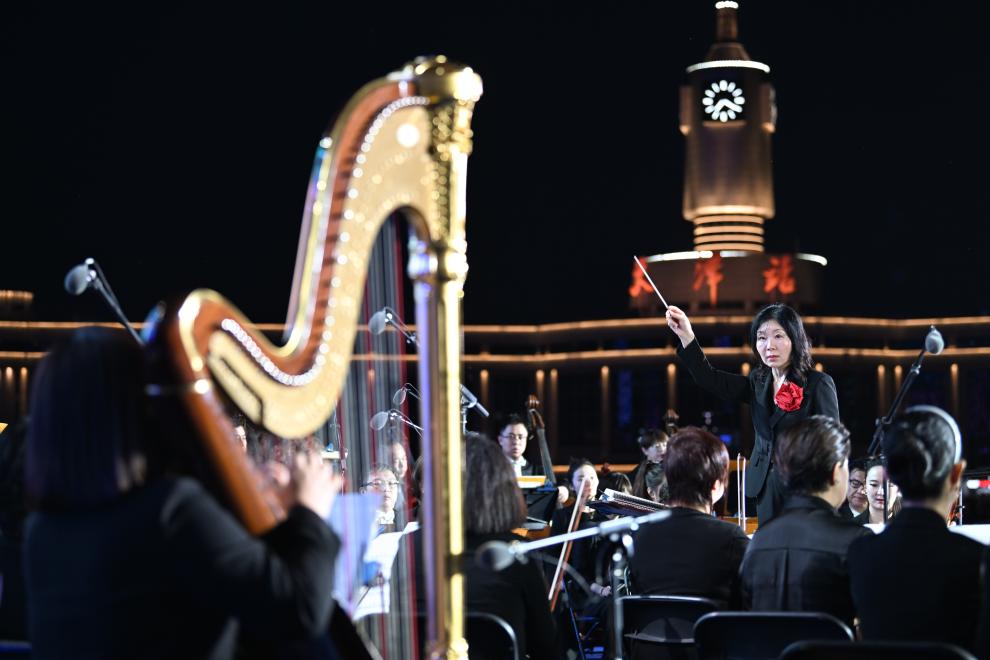 在天津津湾广场亲水平台,天津交响乐团指挥易娟子在桥边音乐汇“春之声”交响音乐会上指挥。新华社记者 孙凡越 摄