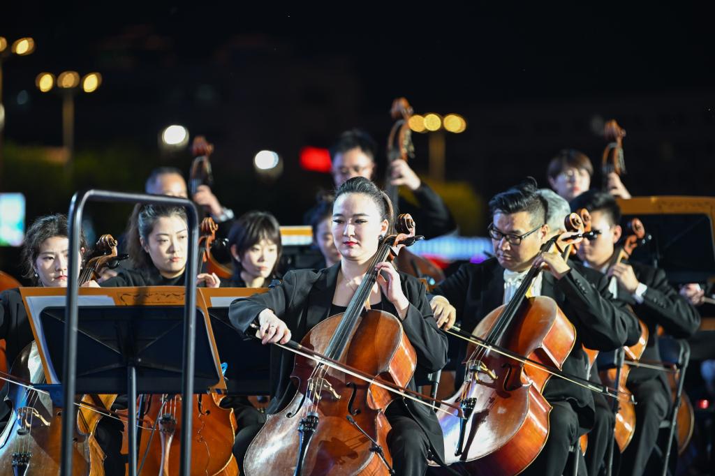 天津交响乐团在天津津湾广场亲水平台为市民游客演出。新华社记者 孙凡越 摄