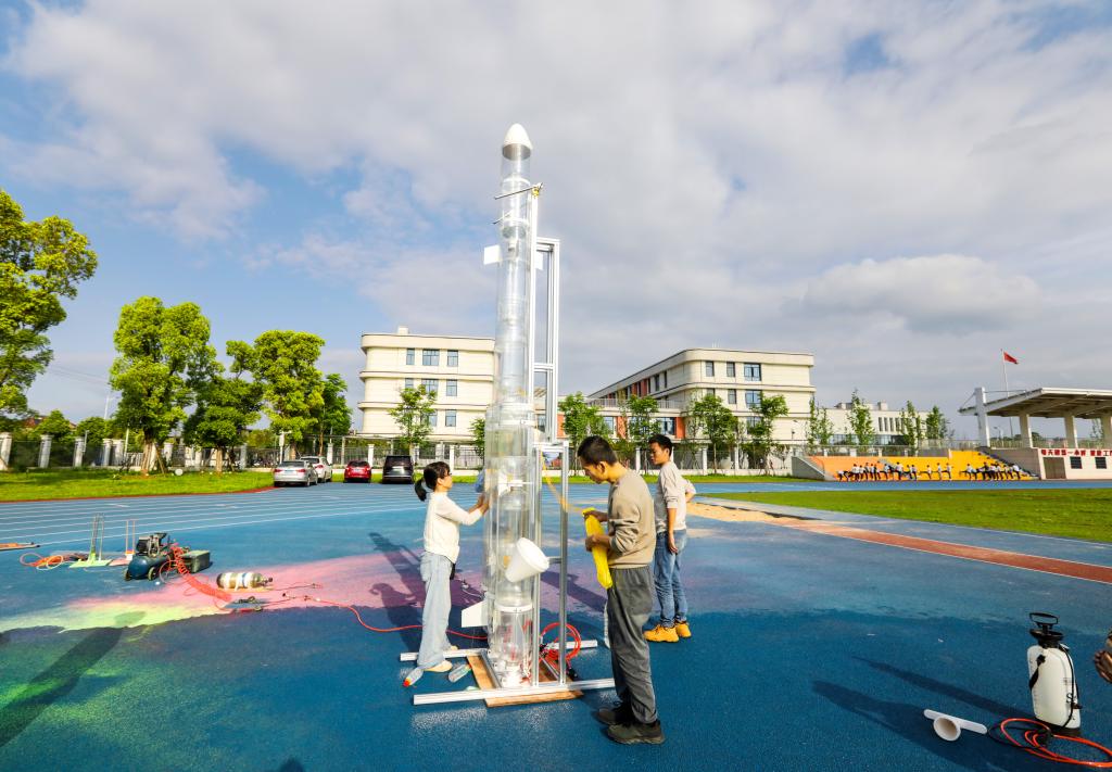 “3、2、1——发射!”“嘭”一声,一枚4米高、由塑料瓶制成的“水火箭”离开发射架,拖着白色水雾直冲蓝天。在江西省吉安市吉安县城北第二中学的操场上,孩子们仰望着“水火箭”升空,眼里闪着光。
