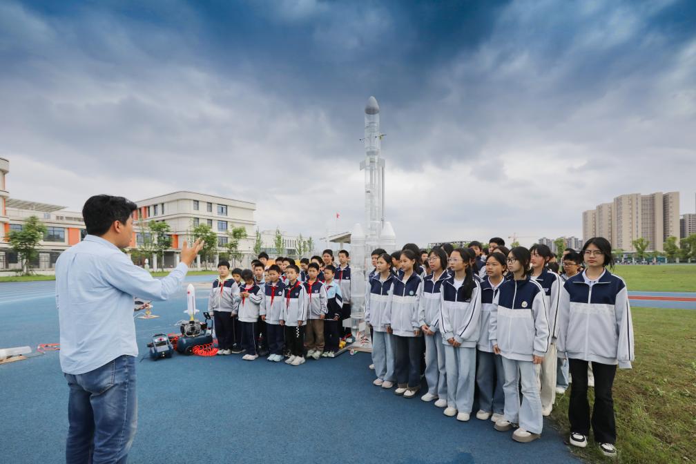 “助推器分离”“一二级分离”“开伞回收”……操场上,科学教师王印看着“水火箭”的飞行轨迹,一步步介绍着相关步骤。直到他说出“发射成功”,孩子们的欢呼声随即响彻操场。