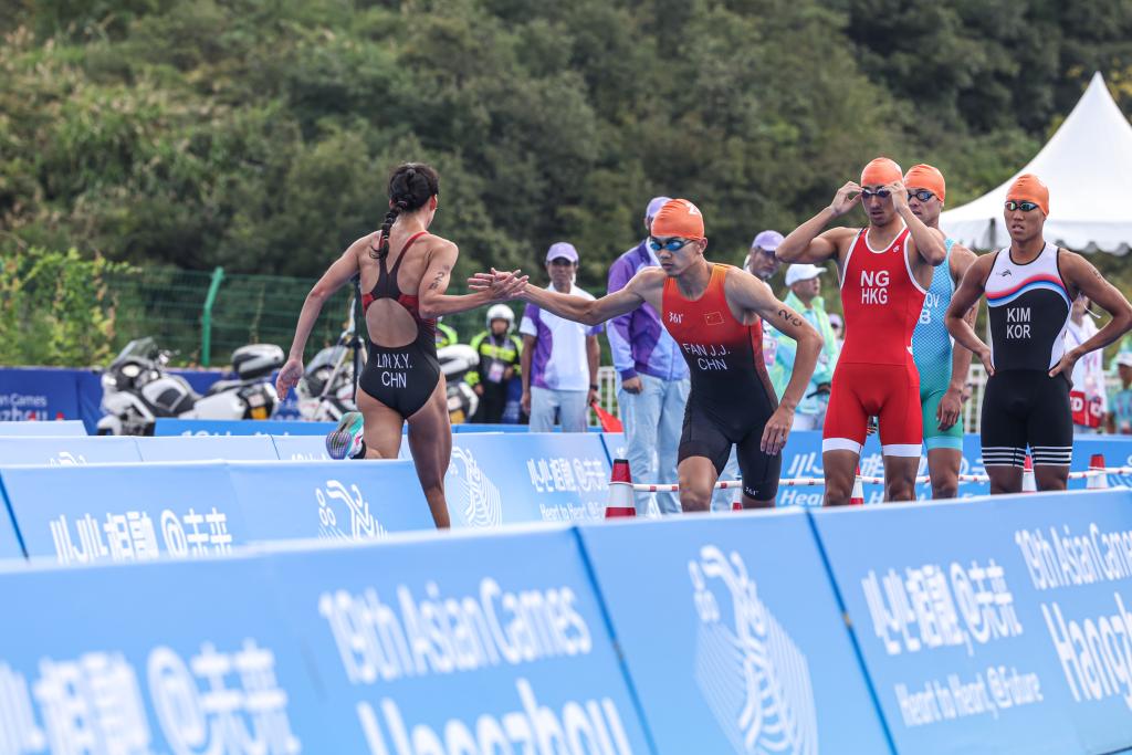 2023年10月2日,中国队选手范俊杰(前右)与队友林鑫瑜(前左)在比赛中接力。当日,杭州亚运会铁人三项混合接力赛在淳安界首体育中心铁人三项赛场举行,中国队获得亚军。新华社记者 吴壮 摄