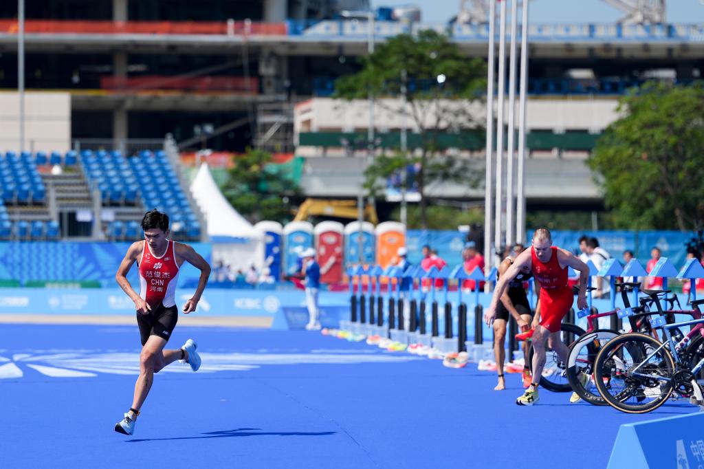 2025年11月15日,河南队选手范俊杰(左)从自行车赛段转换成跑步赛段,他最终获得第十五届全国运动会铁人三项男子个人比赛冠军。新华社记者 吴鲁 摄