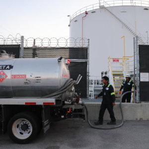 4月24日,在美国洛杉矶国际机场的航油站,工人为航空燃料油罐车注油。新华社发(邱晨摄)