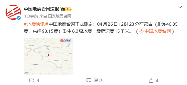 中国地震台网正式测定:4月26日12时23分在蒙古(北纬46.85度,东经93.15度)发生6.0级地震,震源深度15千米。